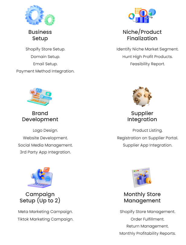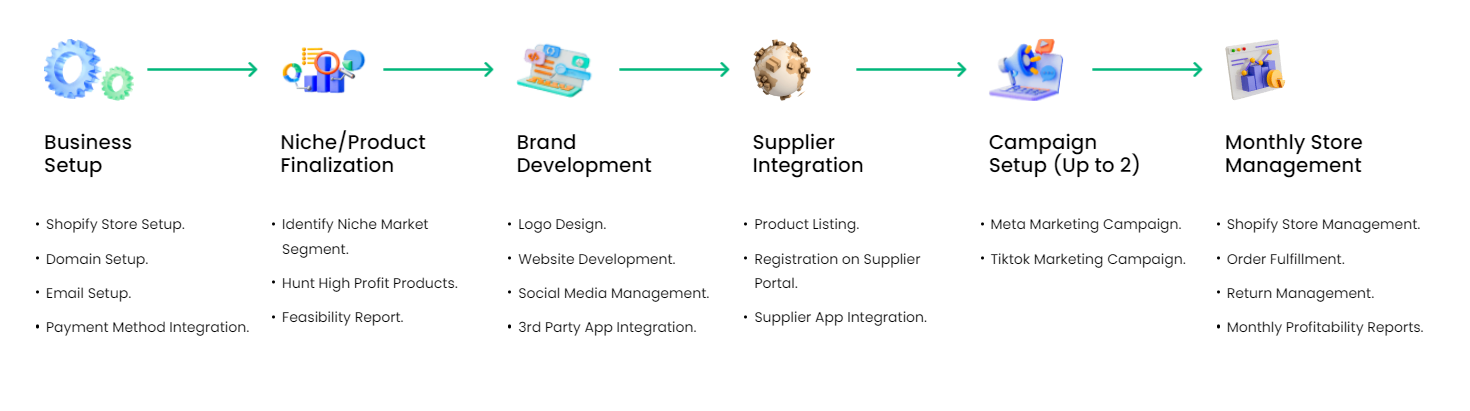 We revolutionize the Shopify dropshipping experience through a meticulously crafted “just-in-time” model. This approach dissects the business setup into essential milestones, each tailored to specific stages of your venture. This strategic breakdown allows us to guide you through each pivotal stage, setting you up for triumph in the dynamic world of dropshipping.